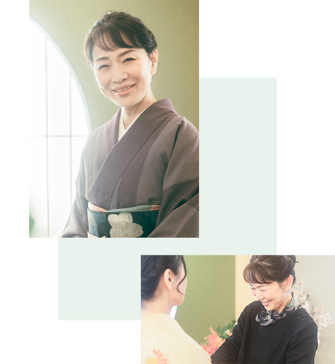 「絶対に苦しいお着付けはしない」という信念のもと、21年間、撮影スタジオや式場、美容室にて、七五三、成人式、結婚式など、お子様からご年配の方まで累計約4,400名以上のお客様のお着付けをしてまいりました。
