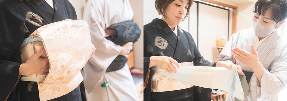 七五三、成人式、結婚式など、特別な日のお着付けから、お茶会、女子会などカジュアルシーンまで、様々な用途に合わせたお着付けにご対応します。