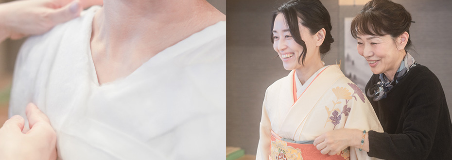 着物は補正が仕上がりの美しさに大きく影響します。お客様お一人おひとりの骨格や体型に合わせて、必要な箇所に補正を入れることで、見た目の美しさと着心地の良さを叶え、さらに着崩れしにくくなります。