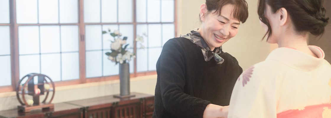 『美しい血流着付け®』は、お客様の健康を第一に考え、大人の女性が求める心地よさと美しさを追求した着付けです。